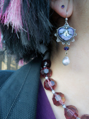 What I'm wearing: Black three-quarter sleeve jacket with piped seams, Speigel | Purple T-shirt, Limited | Grey striped skirt, Nordstrom | Black tights, Calvin Klein | Purple suede pumps, Aerosoles | Purple chunky crystal necklace, gift from a friend | Purple & pearl bat earrings, Jewels by Olivia